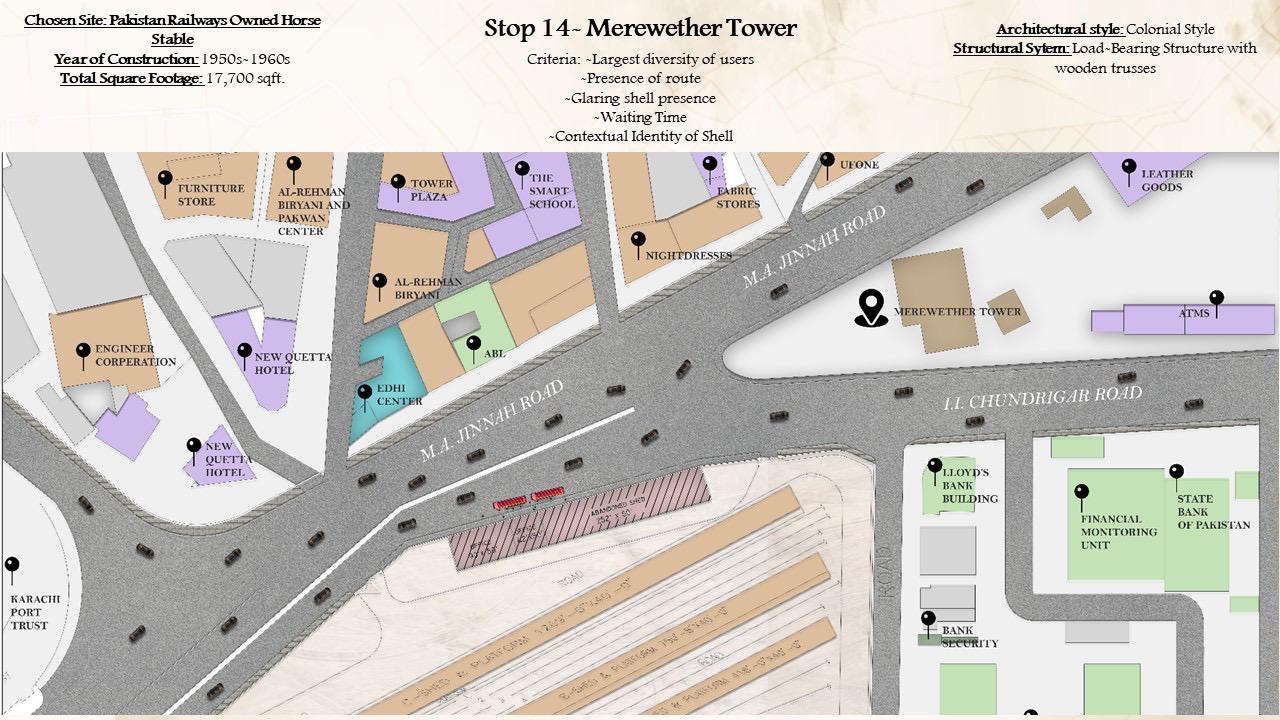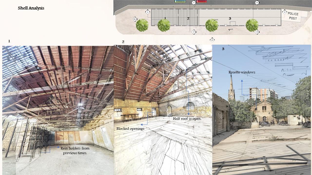 The idea of fleeting revolves around place and traveling identities, like those present amongst people who travel daily on routes of public transport, from which I selected the W-11. Initially, I studied the route of the specific W-11, as it was considered the one and only bus route that passed through the heart of Karachi from New Karachi all the way to Keamari. With there being an extreme extent of users and sites throughout this route, I chose my site as Stop 14, right next to Merewether Tower. The selected site dates back to 1950s and is a Pakistan Railway owned horse stable.