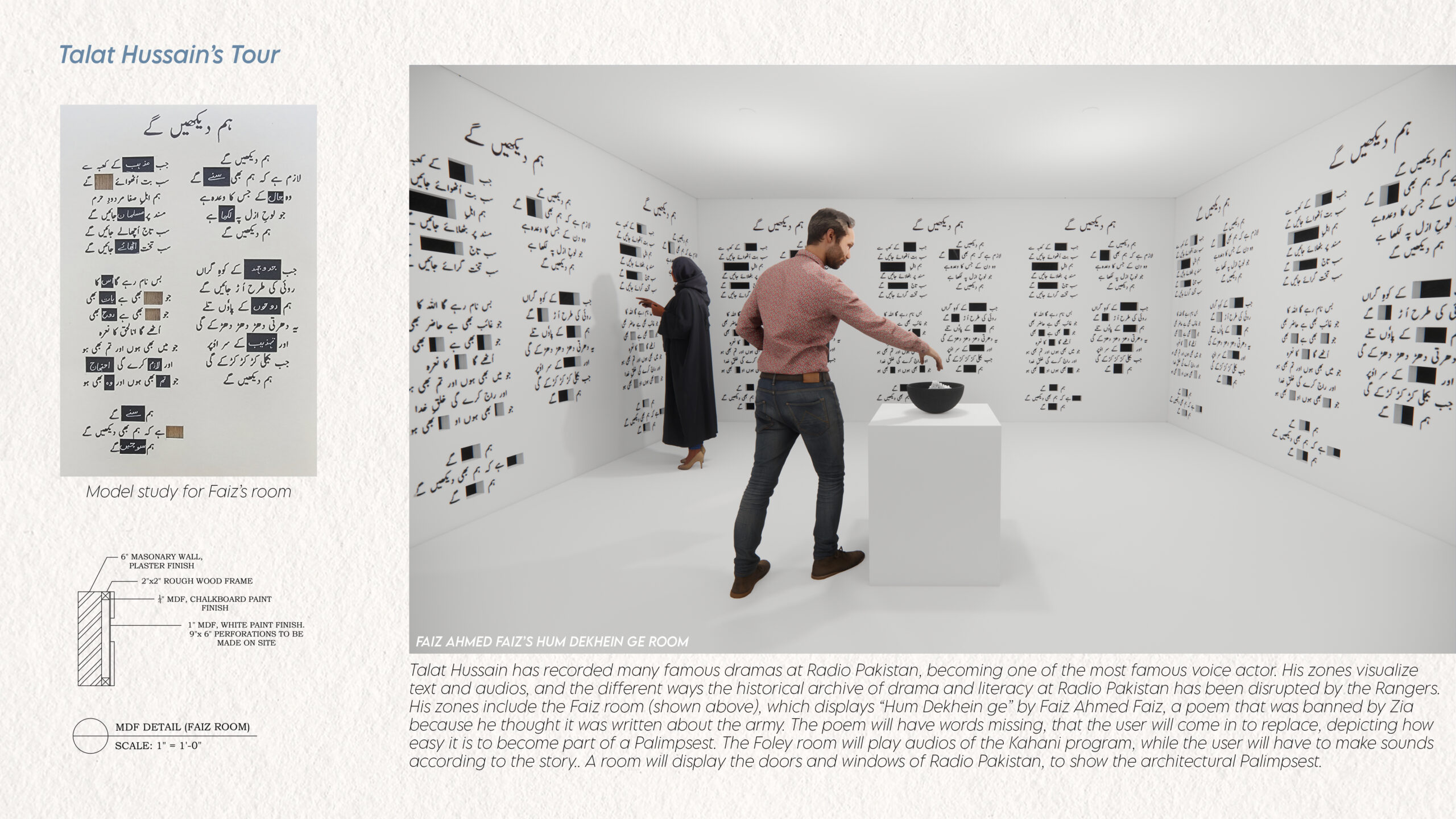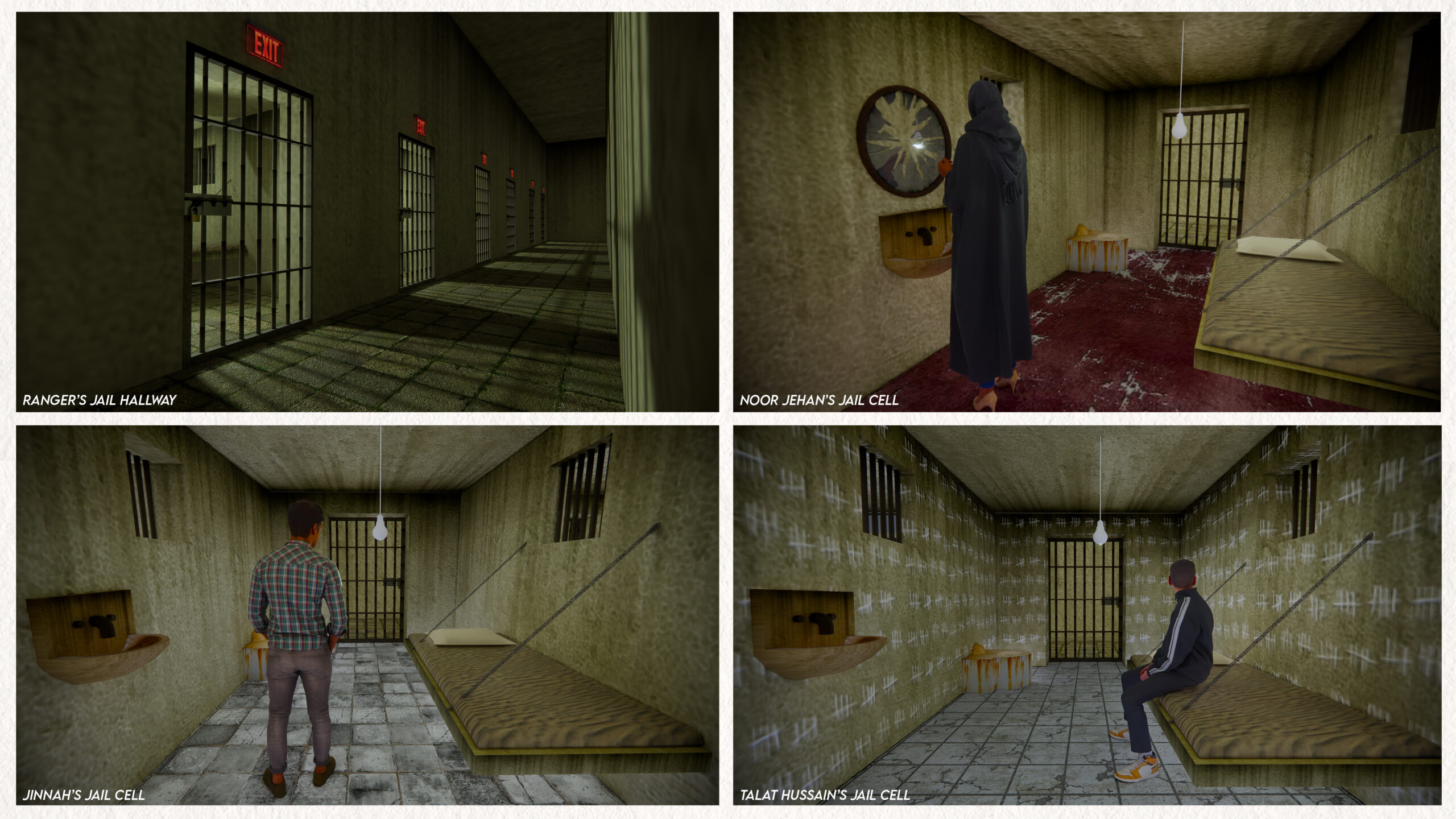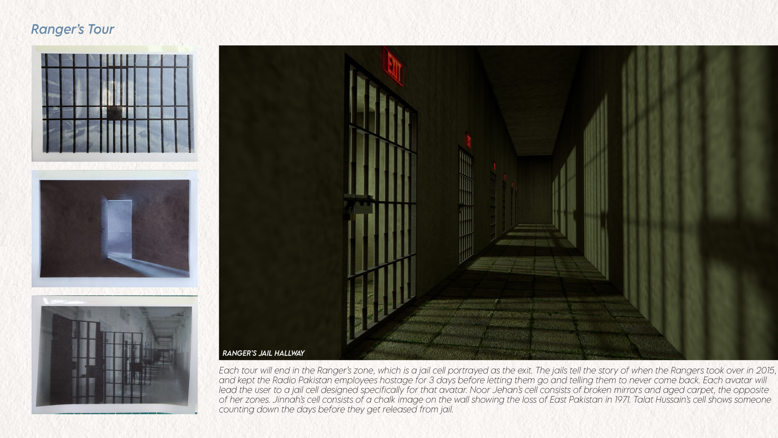 Noor Jehan takes the user through the history of music, emphasizing each space with her glamour. M.A Jinnah takes the user through the history of politics, and the necessary role that Radio Pakistan played in granting people freedom of speech. Talat Hussain, the most famous voice actor to come out of Radio Pakistan, takes the user through the history of drama and literacy. These people would show the user Radio Pakistan through the years, recalling important events that occured, with the influences of the Rangers in each space, to highlight the complex Palimpsest of an important heritage building like Radio Pakistan. At the end of the tour, the user would end up in a ‘jail’, made especially for the avatar who gave them the tour, to show the impact the Rangers had in forever changing the historical Palimpsest as well.