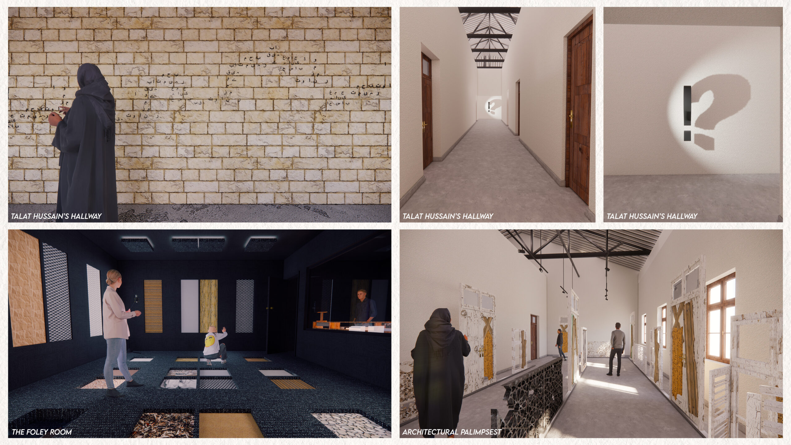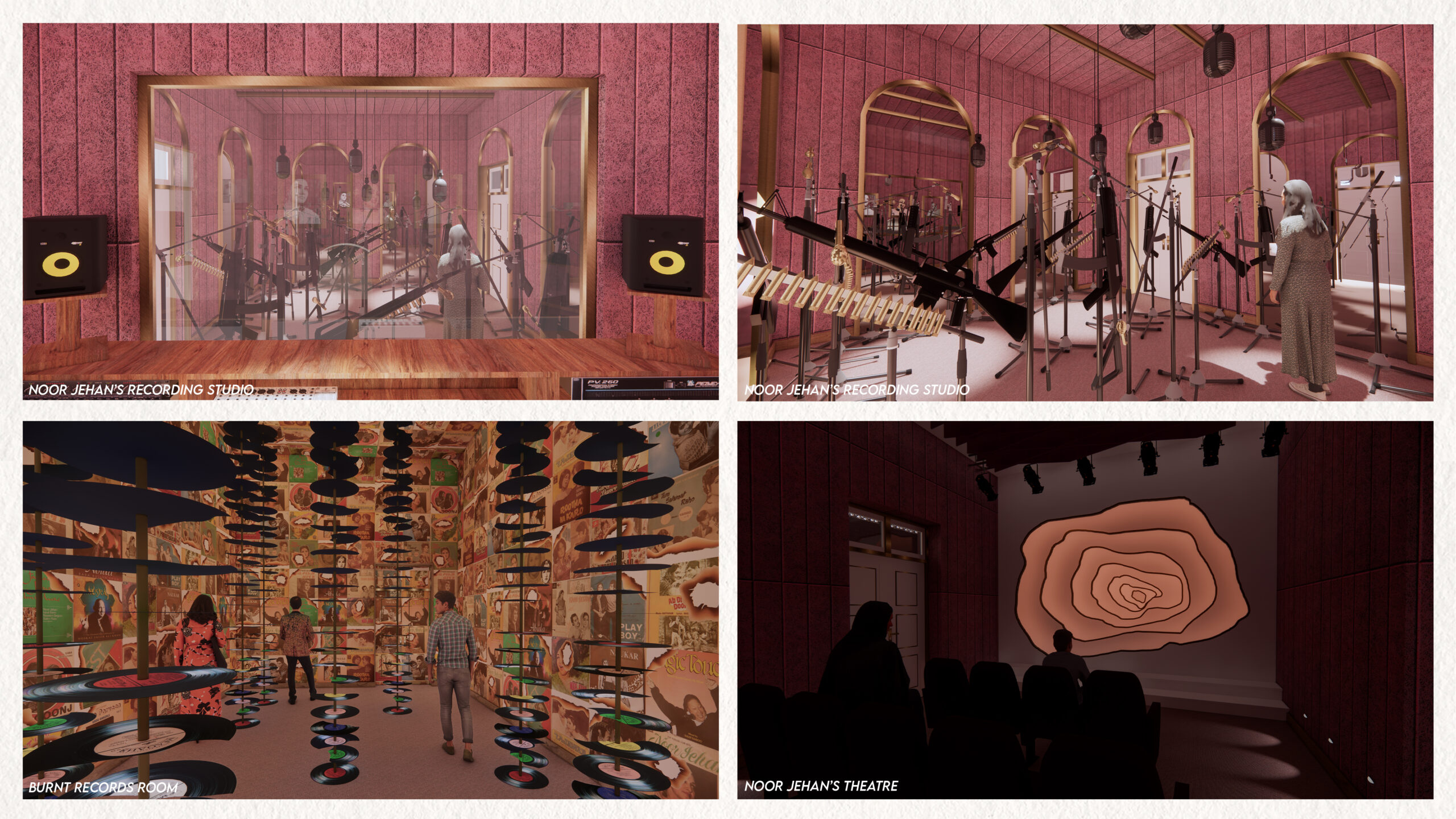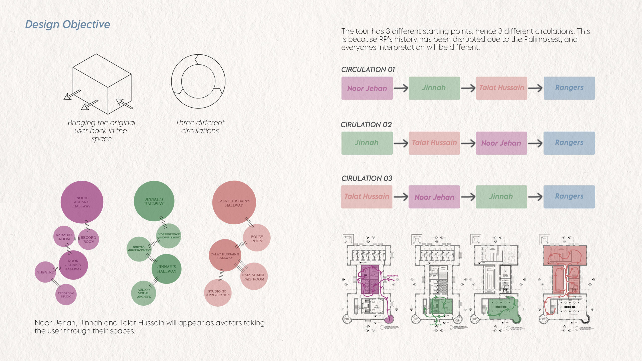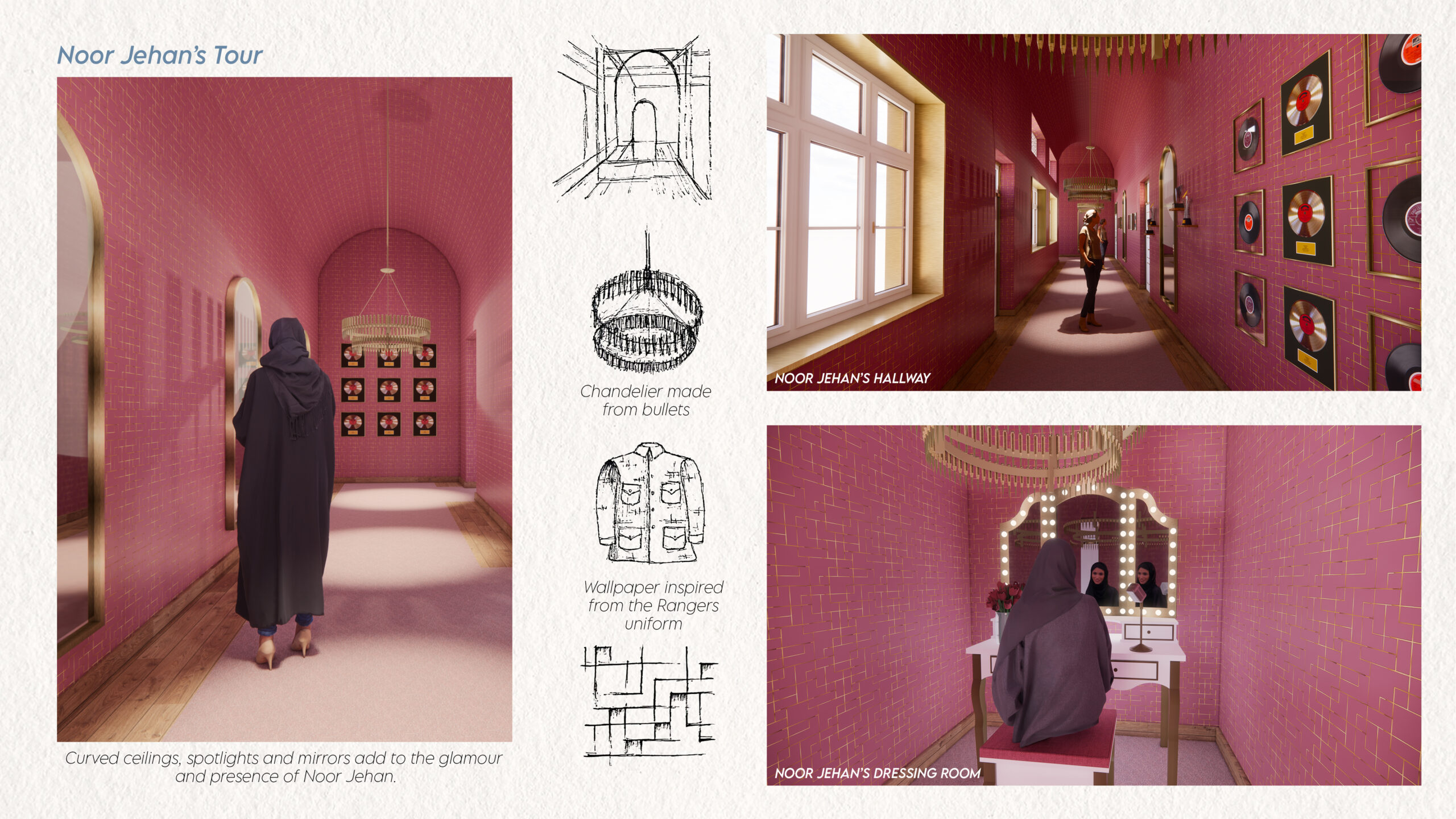 Noor Jehan takes the user through the history of music, emphasizing each space with her glamour. M.A Jinnah takes the user through the history of politics, and the necessary role that Radio Pakistan played in granting people freedom of speech. Talat Hussain, the most famous voice actor to come out of Radio Pakistan, takes the user through the history of drama and literacy. These people would show the user Radio Pakistan through the years, recalling important events that occured, with the influences of the Rangers in each space, to highlight the complex Palimpsest of an important heritage building like Radio Pakistan. At the end of the tour, the user would end up in a ‘jail’, made especially for the avatar who gave them the tour, to show the impact the Rangers had in forever changing the historical Palimpsest as well.