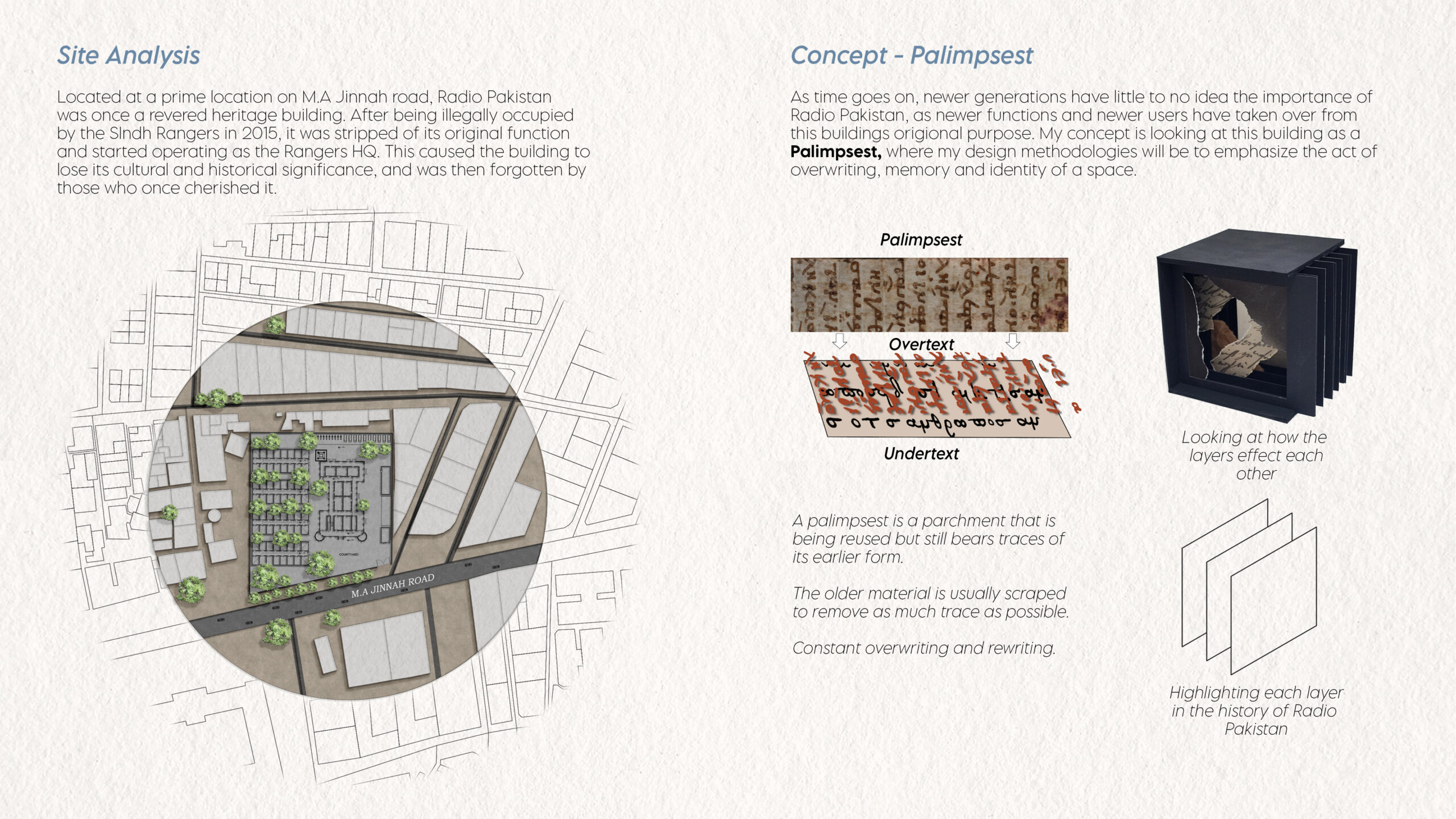 This thesis brings forward a problem that is kept under wraps in Karachi, forced occupation of heritage buildings at the hands of either the Rangers, police or the state. It looks at Radio Pakistan in particular, once the main attraction of M.A Jinnah road; now hidden behind the barricades and barbed wires of the Sindh Rangers, after being converted into the Rangers HQ in 2015.