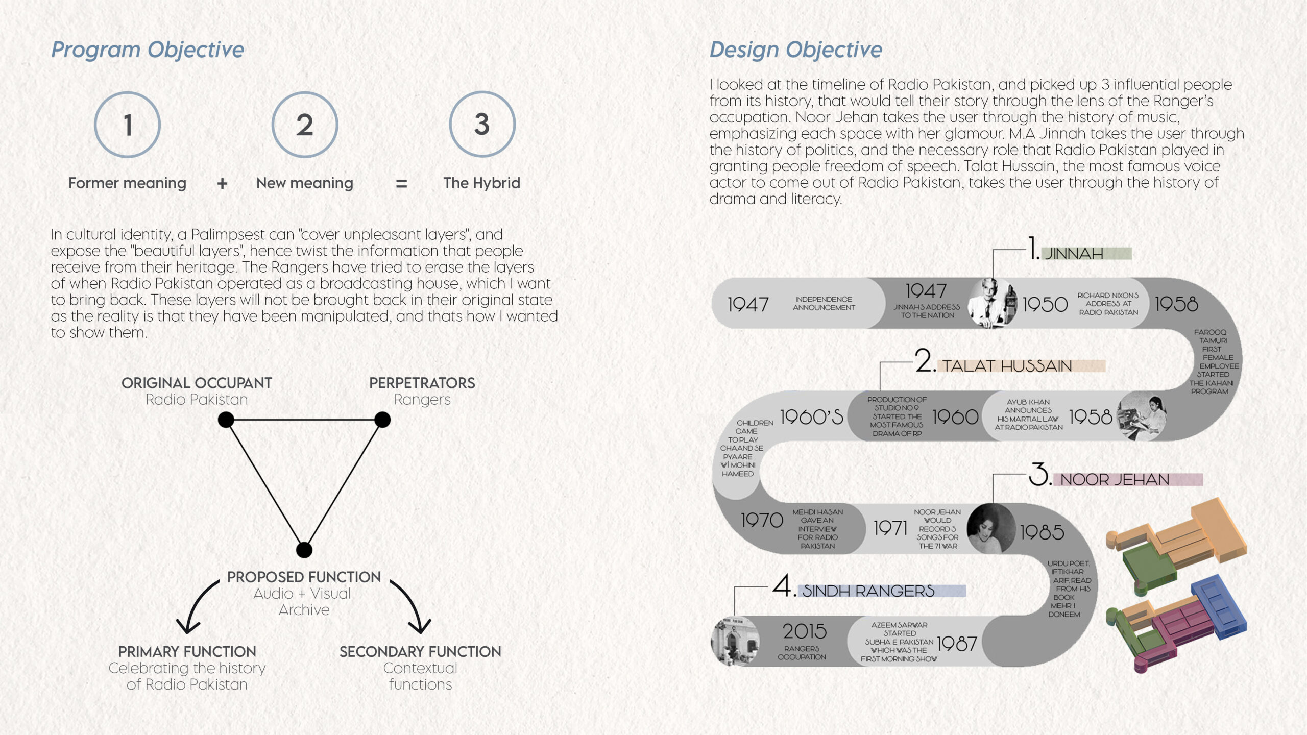I identified how complicated the timeline of Radio Pakistan is, and looked into how all its past layers of history could be highlighted with the impression of the perpetrators, to make the user realize the Palimpsest. I picked 3 influential people from 3 different genres in the history of Radio Pakistan, and re-designed it how they would want the user to see Radio Pakistan; in a curated audio and visual experiential tour through immersive experiences of music, politics and drama.